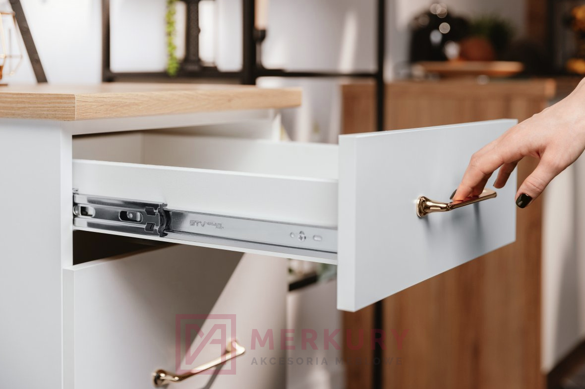 Prowadnice dolnego montażu to obecnie najbardziej zaawansowane rozwiązanie stosowane w nowoczesnym meblarstwie. Ich specjalna konstrukcja przeznaczona jest do zamocowania pod spodem szuflady. Zapewnia to całkowite ukrycie prowadnicy. Tym samym wygląd mebla jest bardziej estetyczny i elegancki. Taka konfiguracja przekłada się na dobrą stabilność i wysoką nośność, sięgającą nawet 30 kg.