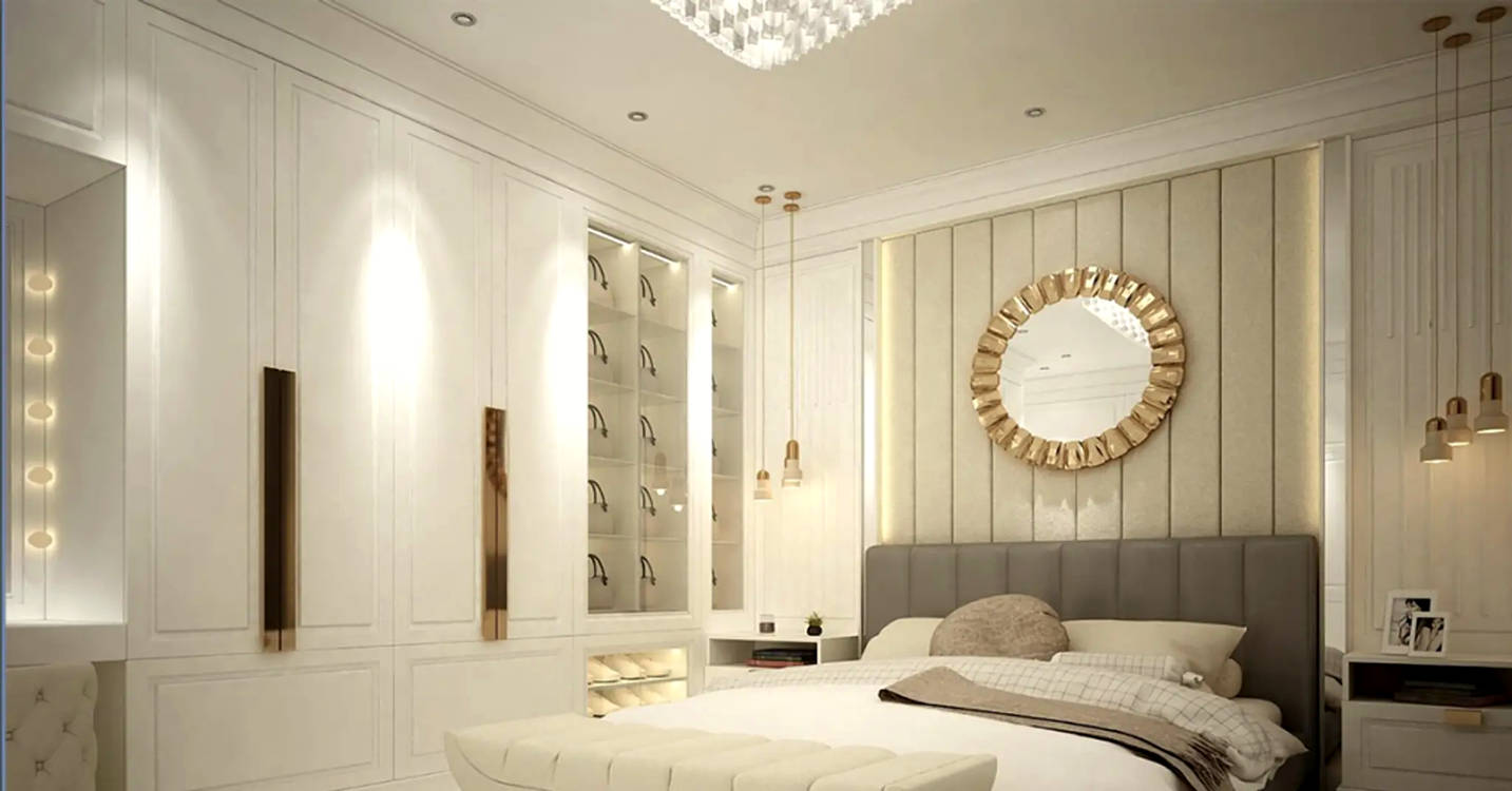 elegancka sypialnia z kryształowym żyrandolem i lustrami
